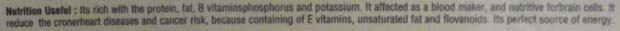 "Nutrition Useful: Its rich with the protein, fat, B vitaminphosphorus and potassium. It affected as a blood maker, and nutritive forebrain cells. It reduce the cronerheart diseases and cancer risk, because containing of E vitamins, unsaturated fat and flovanoids. Its perfect source of energy."