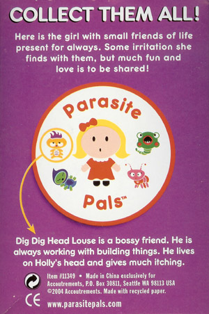 "Dig Dig Head Louse is a bossy friend. He is always working with building things. He lives on Holly's head and gives much itching."